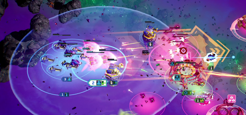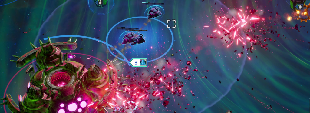 - Mothership Abilities – The build commands and “god powers” of RTS gameplay are all accessed through the player’s Mothership – their primary ship required for all missions. While this decision means that the player is limited to only 4 construction and power options (one for each face button). It makes it much easier to construct stations to build up defenses and gather resources. There is also the added benefit that the game offers new and different powers over the course of a campaign run to support the roguelike advancement.
